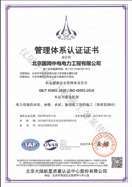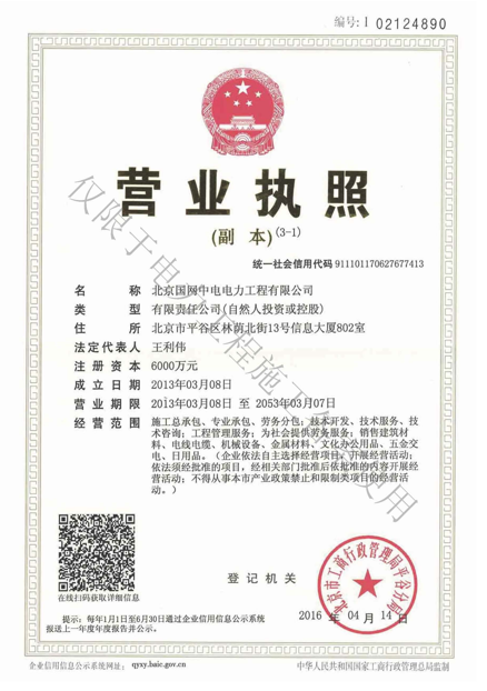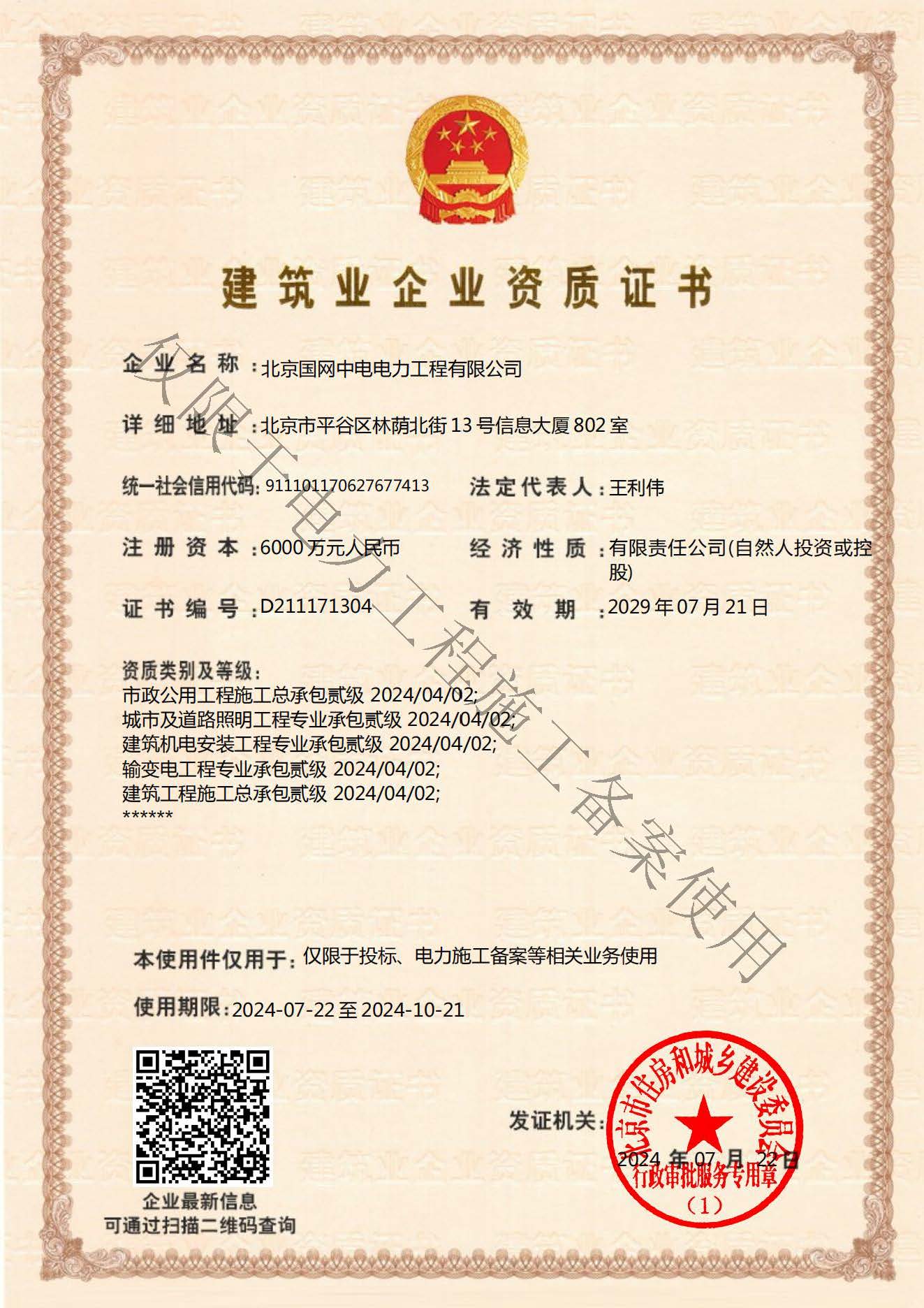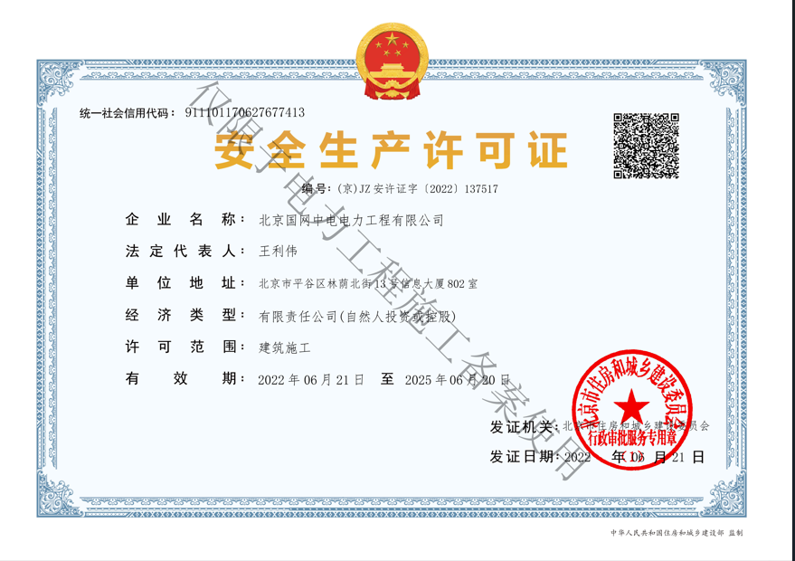 北京國網(wǎng)中電電力工程有限公司,已取得國家電監(jiān)會頒發(fā)的《承裝(修、試)電力設施許可證》、為電力施工承裝四級、承修四級、承試四級企業(yè)。北京市住房和城鄉(xiāng)建設委員會頒發(fā)的房屋建筑施工總承包二級、機電設備安裝工程專業(yè)承包二級、輸變電專業(yè)承包二級、城市及道路照明工程專業(yè)承包二級、市政公用工程總承包二級資質(zhì)、勞務不分等級,已通過ISO9001:2015 GB/T50430-2017質(zhì)量管理體系、GB/T24001-2016/ISO 14001:2015環(huán)境管理體系、